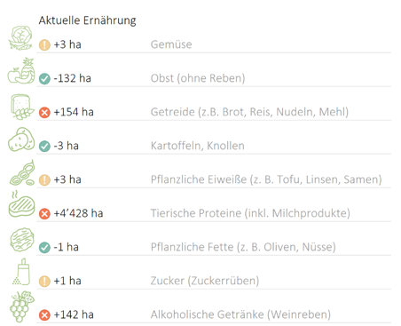 Die Analyse im Fall unseres Kantons zeigt, daß trotz der Überschüsse in bestimmten Kategorien wie Obst, Stärke, Zucker und Milchprodukten weiterhin Herausforderungen in wichtigen Ernährungskategorien wie Gemüse oder pflanzlichen Proteinen bestehen.
