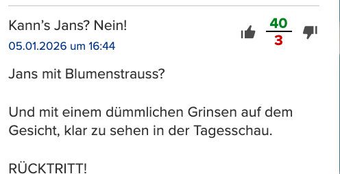 Die kurzen Worte, die Beat Jans sprach bzw. die kurzen Zeilen, die Beat Jans las, waren vom Blatt abgelesen. Bevor er redete beziehungsweise vom Blatt ablas ließ er sich sogar noch das Blatt mit dem Text reichen, er hatte es offenbar nichtmal bei sich. PR-mäßig ein Beispiel, wie man es auf gar keinen Fall machen darf. „Von seiner Rede ist nichts hängengeblieben„, konstatiert denn auch Journalist Lukas Hässig in einem Beitrag. Ein Kommentarschreiber dort kritisiert das „dümmliche Grinsen“ von Beat Jans in Crans-Montana ebenfalls: