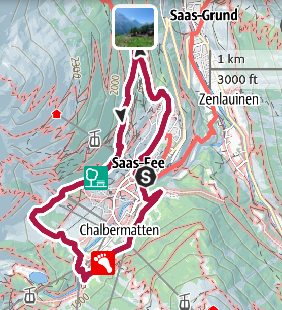 Ab hier dem Waldweg, der oberhalb der Talstationen Plattjen und Spielboden verläuft folgen bis eine Suone (Wasserleitung) erreicht wird, die über die Kneippanlage bis zum Waldweg Saas-Almagell führt. Über die Panoramabrücke geht es zurück zum Postplatz.