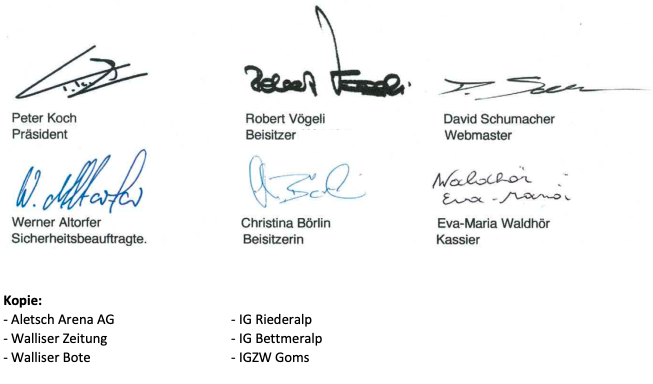 Wir bitten Sie, im Namen der IG Fiescheralp, diesen Fragen und Bedenken ernsthaft und zeitnah nachzugehen und uns eine entsprechende Antwort zur aktuellen Situation zukommen zu lassen.