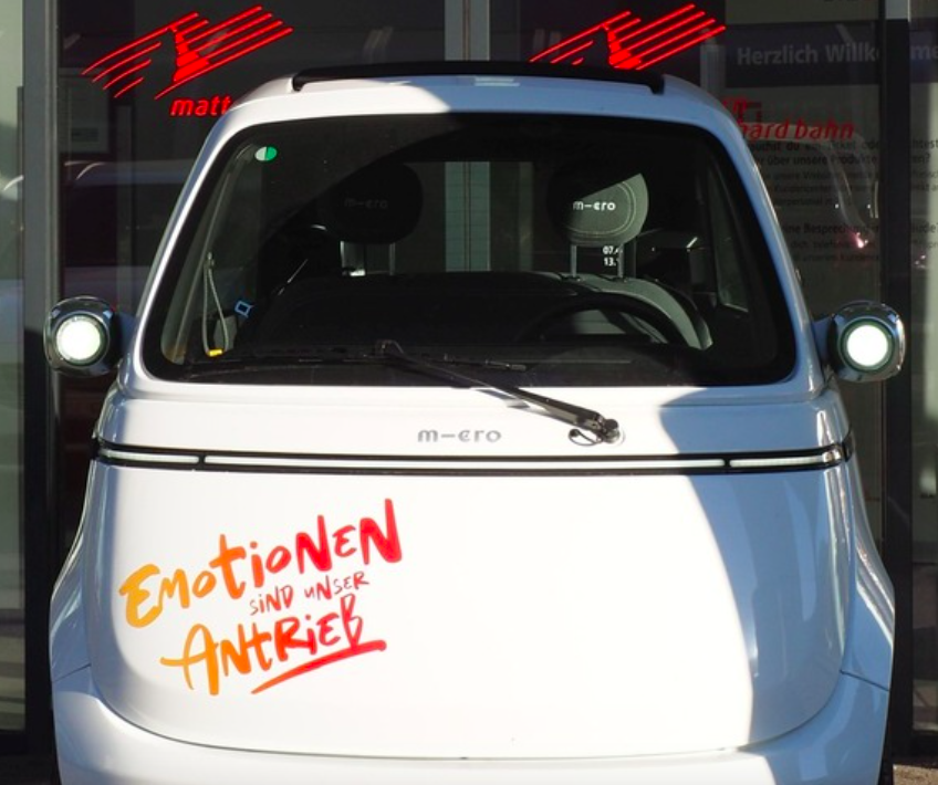Die vollelektrischen Microlinos sind eine Schweizer Erfindung, bieten Platz für zwei Personen und passen quer in jede Parklücke. Sie lassen sich an einer normalen Steckdose laden und verursachen nur einen Drittel des Fußabdrucks eines herkömmlichen Elektroautos.