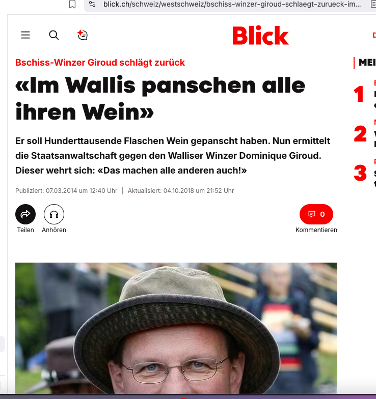 Dieser berichtete unter dem Titel „Bschiss-Winzer Giroud schlägt zurück: «Im Wallis panschen alle ihren Wein»“