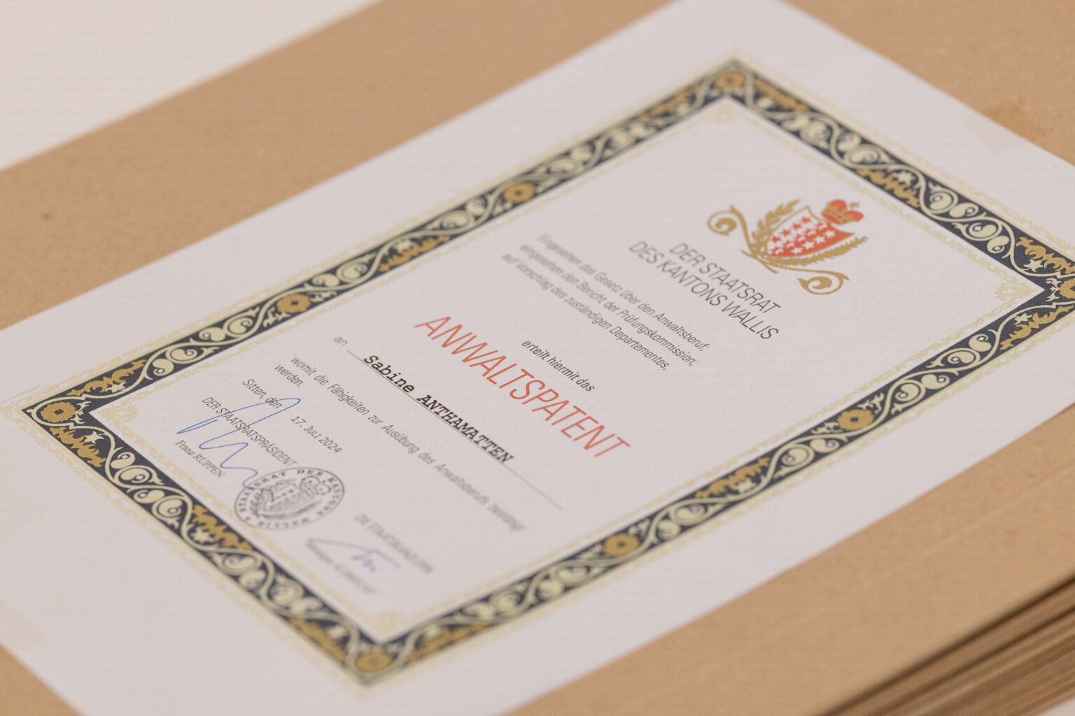 Der Vorsteher des Departements für Sicherheit, Institutionen und Sport (DSIS), Frédéric Favre, überreichte zwölf Anwaltspatente und fünf Notarsdiplome.