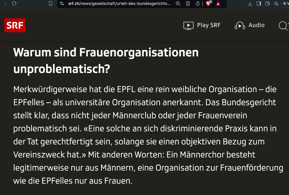 „Warum sind Frauenorganisationen unproblematisch? Merkwürdigerweise hat die EPFL eine rein weibliche Organisation – die EPFelles – als universitäre Organisation anerkannt. Das Bundesgericht stellt klar, daß nicht jeder Männerclub oder jeder Frauenverein problematisch sei. «Eine solche an sich diskriminierende Praxis kann in der Tat gerechtfertigt sein, solange sie einen objektiven Bezug zum Vereinszweck hat.» Mit anderen Worten: Ein Männerchor besteht legitimerweise nur aus Männern, eine Organisation zur Frauenförderung wie die EPFelles nur aus Frauen.“